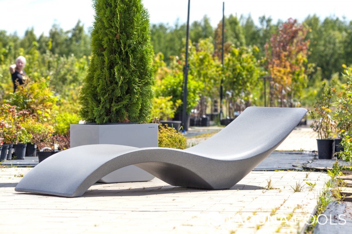 Шезлонг из материала под камень стоит на деревянном настиле в окружении зелёных растений.